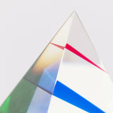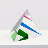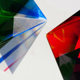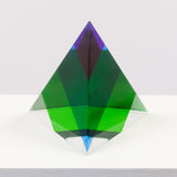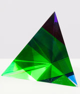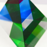 Two vivid shades of green, one emerald, one jade, interact with primary blue and royal purple on this asymmetrical triangle sculpture. Mihich perfectly balances darker saturated colors with clear spaces of acrylic. This is one of the most beautiful combination of colors we've ever handled by this master of color and light.