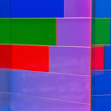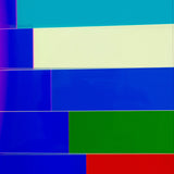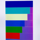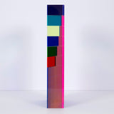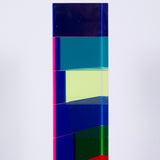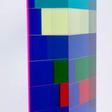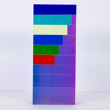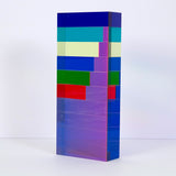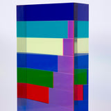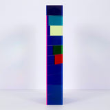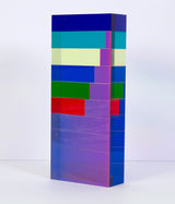 "Market Brick” is a bold and impressive table-top sized sculpture, with Vasa's signature colors suspended in acrylic. A group of rectangles of various widths but identical heights are stacked together, accentuating the contrasts between the saturated hues. Typical of his work in the 90's, Vasa juxtaposes shades of blue (Yves Klein, aqua and navy) with his signature purple grape.