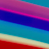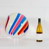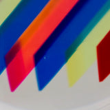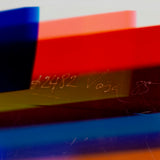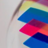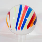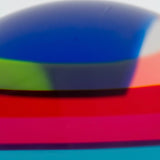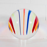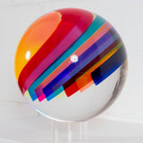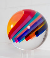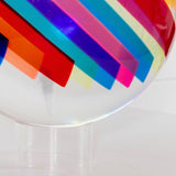 Resting on a custom clear acrylic stand, the sculpture reveals different colors and densities depending on its position or the viewer's. Thin bands of a rainbow of colors including cherry red, tangerine, Yves Klein blue, lime, pale yellow, dusty blue, magenta and turquoise are suspended in a clear acrylic orb.