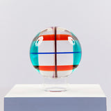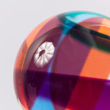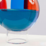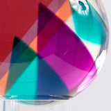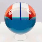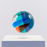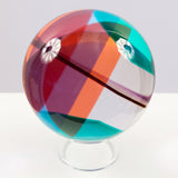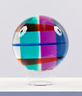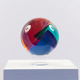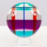 Resting on a custom clear acrylic stand, the sculpture reveals different colors and densities depending on its position or the viewer's. Some of its major colors include grape, melon red and teal.