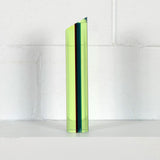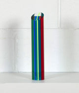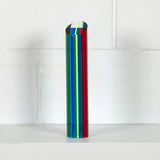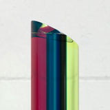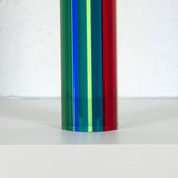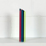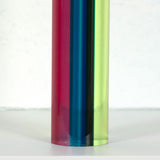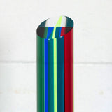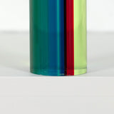 This cylindrical sculpture is an ideal table or desktop size, emitting colorful shadows far greater than it's scale. The cylinder is bisected vertically by a neon royal blue splices, and horizontally in half by light green and cherry red. These intersecting elements create four unique color quadrants resulting in dynamic shades of blue, purple grape, hot pink, and sea green.
