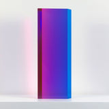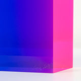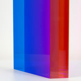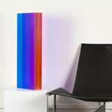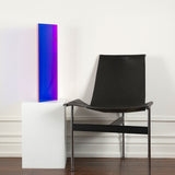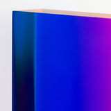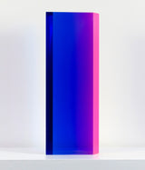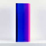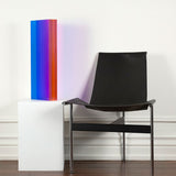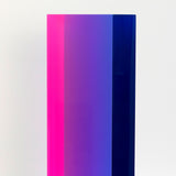 The “Texas Parallelogram” features a strong palette of electric violet, indigo, fluorescent pink contrasted with hyper-pop orange. As with the best of Mihich's work, the color distorts as the viewer moves around the sculpture. The sharp layers of complementary colors slant and expand when viewed from the side, revealing a surprising illumination of a different color.