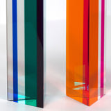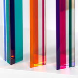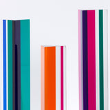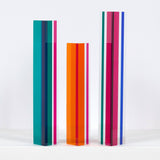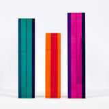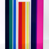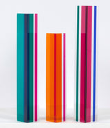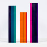 Composed of three columns, in cherry red, tangerine orange, aqua, grape purple, and magenta, the main colors vanish or transform depending on how they are positioned individually and in relation to their siblings.Â