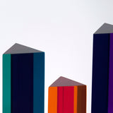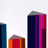 Perhaps most dramatically, the triangular columns can be turned so one of their three pointed sides faces the viewer to reveal a completely different color pattern/palette. Each of the columns utilizes different color blocks with accent stripes running vertically to transform or highlight different shades of the dominate colors, and allow a completely new arrangement when viewed from different angles side.Â