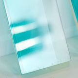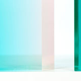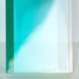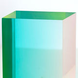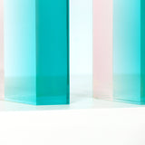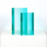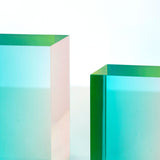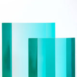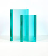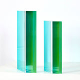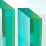 On first glance, the sculptures seem to be made of glass, as the material at this thickness appears to have a specific blue-green hue. Initially the two pieces present themselves as monochromatic, however on closer inspection it is revealed that there are clear elements as well as canary yellow and clover green planes of color suspended in the forms.