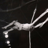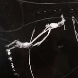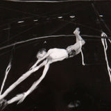 Captured in mid-flight are two costumed aerialists performing a hands-free trick at the circus. Their looping safety ropes and skin contrast against the dark background of the tent. This brief moment of daring motion is distorted to emphasize the looping shapes of the ropes and whirling nature of their movement. Together the two performers seem surrounded by only darkness, ribboning ropes, and alienesque blurred lights.
