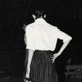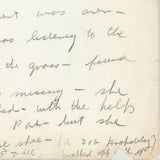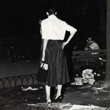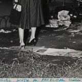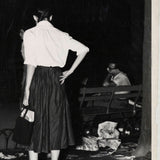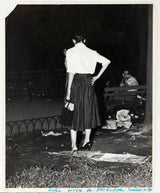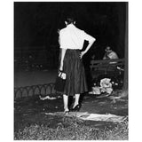 Detailed notes verso explain that the woman is simply looking for a lost shoe. What first appears to be perhaps menacing, turns out to be more amusing. The subject has naked feet on newspapers with a hand on her hip, she seems to wait to find a solution. Weegee elaborated in ink: “a dog probably walked off with it.”