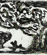 The second work, now offered here, is a highly stylized original landscape and is slightly more unexpected. It is rare in Etrog's oeuvre to have an uninhabited landscape, one that is void of characters and while it is expressionistic it is simultaneously fairly straightforward. Unlike some of the previous settings created in two dimensions by the artist, this landscape is simple and serene, almost Arcadia-like with its giant tree in the foreground.