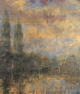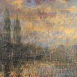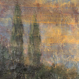 "Ciao Gaia" is a fantastic example of Scherman's mastery of encaustic as well as a rare depiction of a landscape. The intricate layers, varying opacity, and remarkably rich texture contribute to a sumptuously elegant and atmospheric Italianate landscape punctuated by two trees. These elegant cypresses emerge from beneath luminous mauve and lemon brushwork adding a dreamy ambiance to the work.