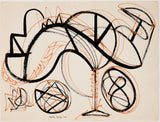 Dehner had a strict palette and used color judiciously and sparingly. Like many of her creations from the 1950's, the structures or dominant forms are rendered in graphite or ink and they are highlighted, illuminated, or here in this work both shadowed or embellished with an energetic addition of terracotta.