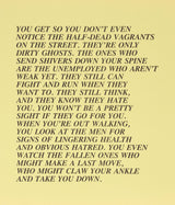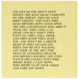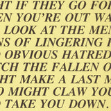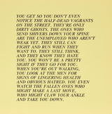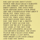 This canary yellow Inflammatory Essay drips with satire and stark reality. Here class differences and perceptions are explored as homeless individuals described as "dirty ghosts" are accused of being dangerous when not completely subdued by starvation, illness, or injury. Although our understanding of the socio-economic and mental health factors affecting homeless individuals has evolved over the last few decades, Holzer shrewdly exposes the callous prejudice and fearful stereotypes historically carried by many towards them.