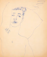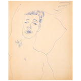 This drawing is a paradigm of Warhol's mastery of line. The elegant portrait presents the sitter draped over a pillow, his arm resting gently on his forehead as he closes his eyes with a soft gaze.