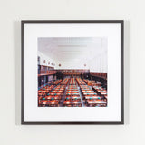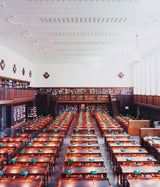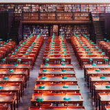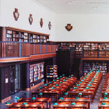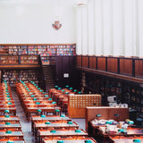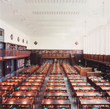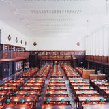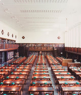 This is a classic and iconic image of Höfer's. The architectural and decorative details of this grand library, specifically the neat rows of desks with their green glass lamps, create a pattern that approaches abstraction.
