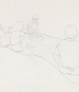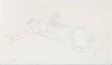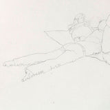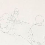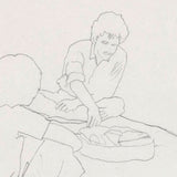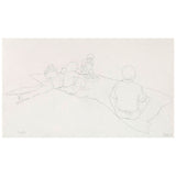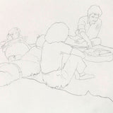 During the late 1970's and early 80's Pachter depicted his friends in casual and lighthearted scenarios, such as enjoying a picnic. This particular drawing features a beautiful perspective enabling the long picnic blanket and group of friends to come to life. The empty space around the figures is a poignant example of Pachter’s drawings. Loose and simple lines form expressive figures filled with movement, yet the empty space is left for the viewers' imagination to fill in. The title and location of this drawing are noted by the artist in pencil in the lower-left corner.