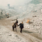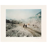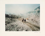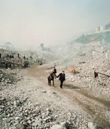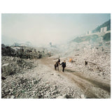 "Feng Jie #5" depicts a demolished landscape, marked by piles of rubble and a dusty haze that obscures the background. Centered in the middle of the work is a man leading his donkey down a dirt road amidst the destruction.