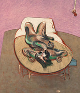 This work is a paradigm of Bacon's style. His unique approach to figuration produced humans undone by their visceral, almost violent distortions. In this image, a sole figure lies nude on a bed; warped limbs splayed apart above a heavily distorted head. Like all of Bacon's subjects, this figure dances between depictions of raw sexuality, violence, and internal torment.