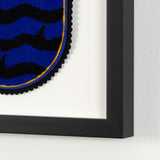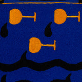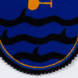 "Down the Drink" is a cobalt crest featuring three horizontal cocktail glasses, all tipped over, with their contents spilling out in a cascade of voluminous droplets. The droplets pour over into a body of rolling waves, where their peaks are disguised (or possibly reveal themselves) as threatening shark fins. (This motif also appears as a screenprint in the "Fear Management" series.)