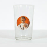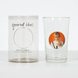 Drinking glass with offset adhesive label in plastic container with gold hot-stamping