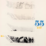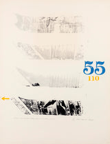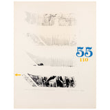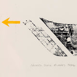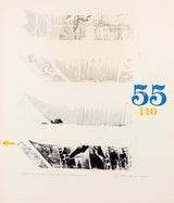 Although Curnoe created many works on paper, he curiously did very little printmaking. Here we find an unusual application of ink to lithograph using several hockey stick blades. The effect is intriguing, simultaneously familiar and abstracted. Hockey Stick Blades from West Lions Park, London includes stamped numbers and graphic arrows in the iconic yellow Curnoe fans know well. While not considered a monotype, each print in the edition varies slightly from the arrangement of hockey blades, the intensity of the ink and of course the bold numbering.