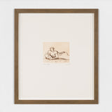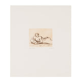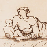 This etching is one of eight from Moore's Mother and Child portfolio. A mother lays on the floor, holding a seated child in her outstretched arms. She gazes at her offspring, frozen in this precious moment. The figures are portrayed in Moore's sculptural style, their length and fullness coming through their two-dimensional portrayal.