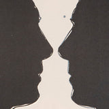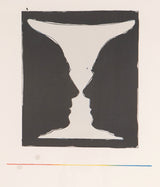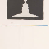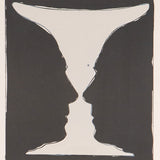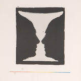 Completed in 1973, "Cups 2 Picasso" was created in honor of Picasso who passed away the same year. Picasso played a key role in Johns advancement as a printmaker and an artist in general. This work features two mirrored images of Picasso's profile silhouetted, creating the illusion of a goblet shaped vessel in between.