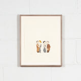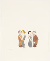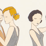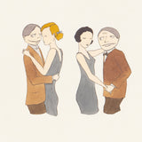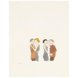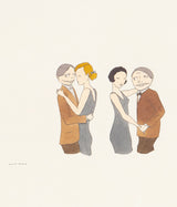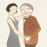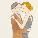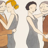 This work is classic Dzama in its mix of mystery and familiarity. Two couples attired in corresponding looks appear locked in a slow dance together. Though the women have different hair colors and styles, the men are almost identical looking -with curiously wide moon-like faces. Like the best of Dzama's work the viewer is drawn in and asked to assemble a context and a narrative.