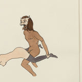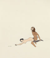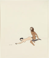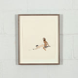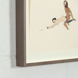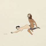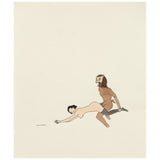 This watercolor contains many of Dzama's signature elements; a human/animal hybrid, references to mythology/folklore, and eroticism. In this work, a woman and possibly a minotaur (a figure from Greek mythology) engage in a sexual encounter. Despite the intense sexuality of the work, Dzama maintains a sardonic sense of playfulness and ambiguity. Is this an actual minotaur, or simply a man in a mask?