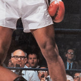 The dramatic lighting and captivated crowd make the image appear hyper-real and almost cinematic. Leifer captures every detail, from the open-mouth expressions of the audience to the signature embroidery on Liston’s boxing shorts. Â