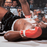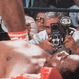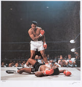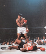 This photograph is one of Leifer's most iconic images. Here Mohammad Ali swings his glove in victory as he knocks his opponent Sonny Liston to the boxing ring floor. This legendary image was captured during the 1965 World Heavyweight Title championship.