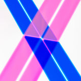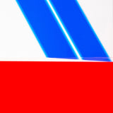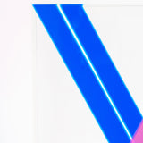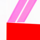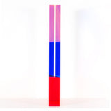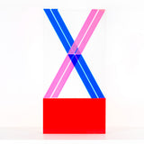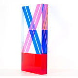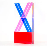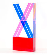 When viewed straight on, this work showcases an "X" made up of four internal and intersecting rectangular planes. The "X", suspended in a clear acrylic rectangle, completely disappears when viewed from the side, morphing into a minimalistic color block arrangement.