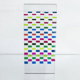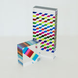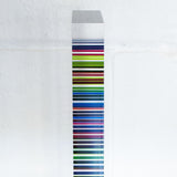 Straight on, with the widest point directly facing the viewer, the work resembles a model of a Modernist apartment with tiers of alternating candy colors. Seen from the side, however, the colors merge, recalling the best Op Art painting arrangements.